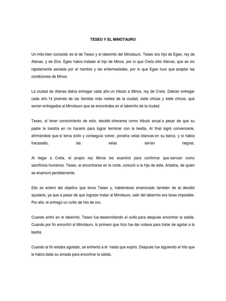 HABÍA UNA VEZ UN NIÑO LLAMADO TESEO CUYO PADRE EL REY EGEO DE ATENAS LE DIJO QUE CUANDO TUVIERA LA FUERZA SUFICIENTE PARA LEVANTAR LA ROCA Y COGER LA ESPADA QUE ESTABA BAJO ELLA SERÍA LIBRE DE ELEGIR SU DESTINO. Para continuar con este resumen corto del mito del Minotauro debemos hablar sobre cómo llegó esta bestia hasta el laberinto y cuál fue su papel una vez allí. Si continúas navegando por ese sitio web aceptas el uso de cookies.
